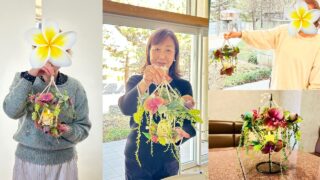 1月は素敵な色の胡蝶蘭が映える、トロピカルフライングリースを作りました。リースの土台は使わずに、グリーンビーズバインを丸くリースのようにして花をつけていきます。皆さん思うがままにアレンジしていただき、」とても素敵なフライングリースが完成しました。
