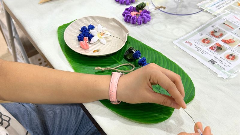 ワイヤーにお花を通していくだけの、とてもシンプルな工程なので、初めての方でも安心してご参加いただける内容です。