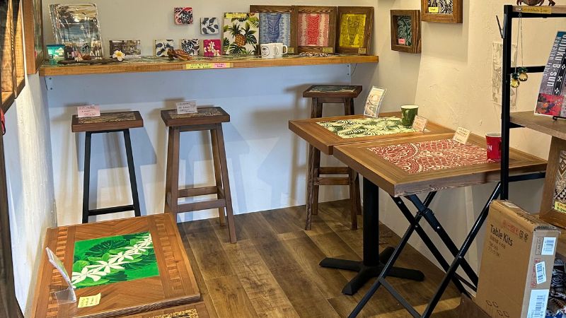 ハワイアンの家具で、テーブルにこんなハワイアンな柄が入っているの見たことない!