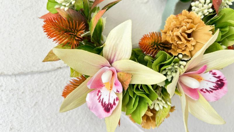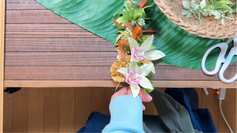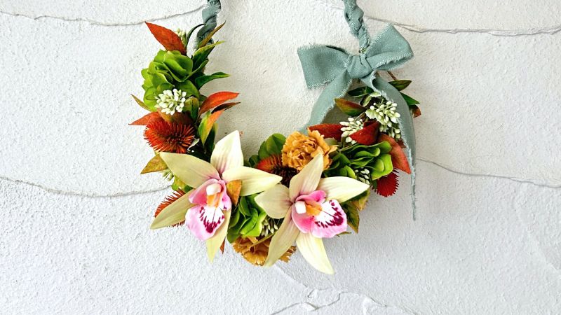 そこで今回は、レイを短く編む「ハーフレイ」にして、素敵なリボンを合わせた壁掛けにもなるレイアレンジを作ります。
