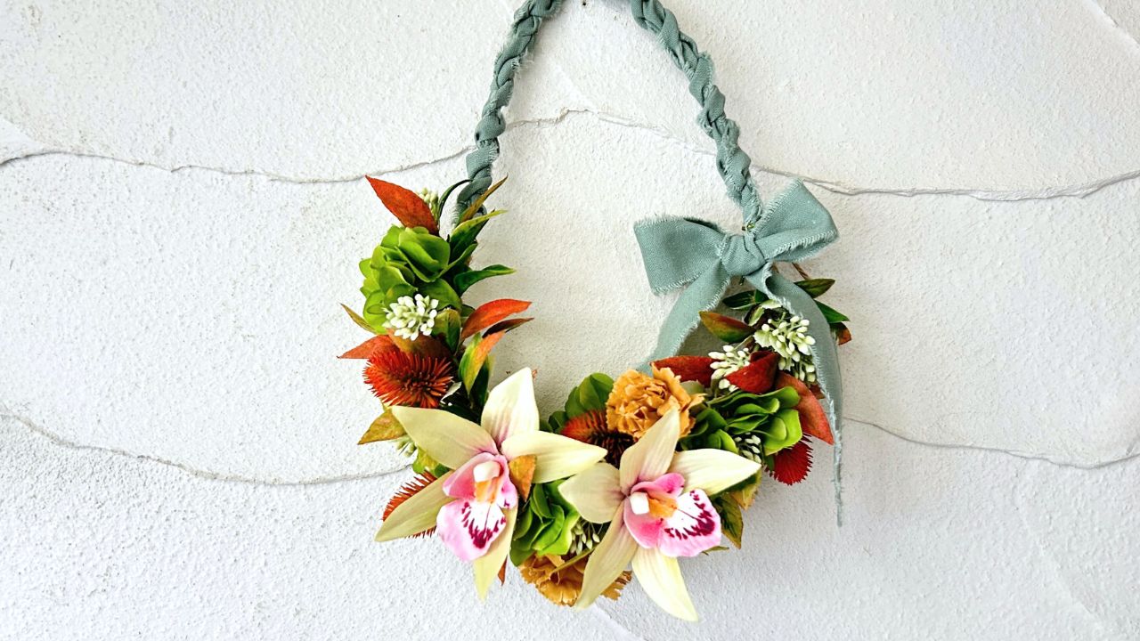 そこで今回は、レイを短く編む「ハーフレイ」にして、素敵なリボンを合わせた壁掛けにもなるレイアレンジを作ります。